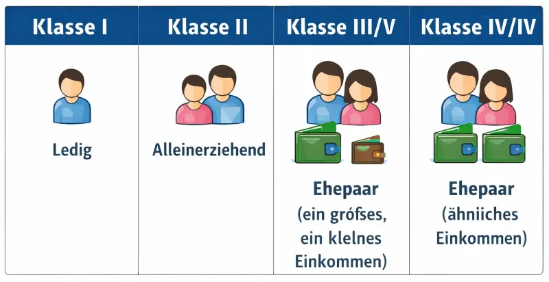 - Klasse IV/IV: Verheiratete (Standard, wenn beide ähnlich verdienen).